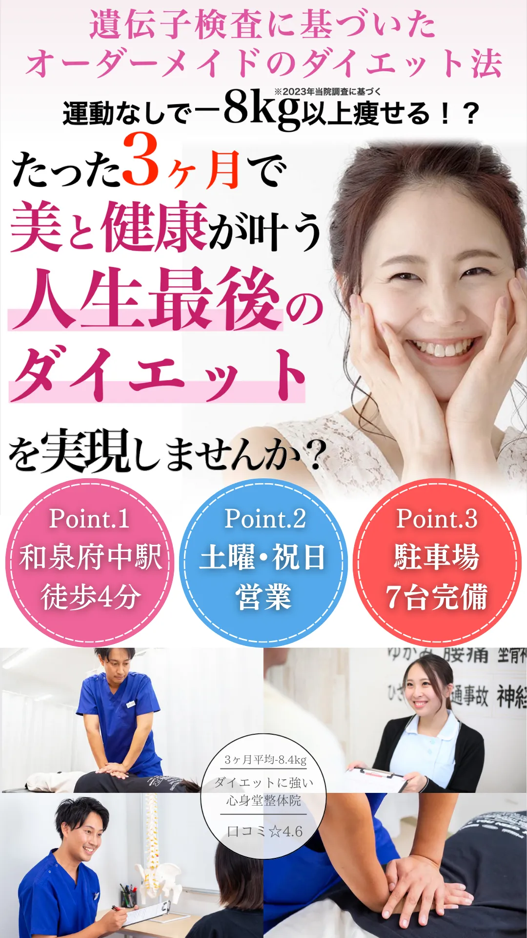 ダイエットのプロとしての証である資格を保有し、数多くのお客様から支持され、あなたの悩みに真正面から向き合う、心身堂整体院 泉大津院に来院し、健康と美容の先にある理想の自分を叶えて心から思いっきり楽しめる人生を手に入れる道。